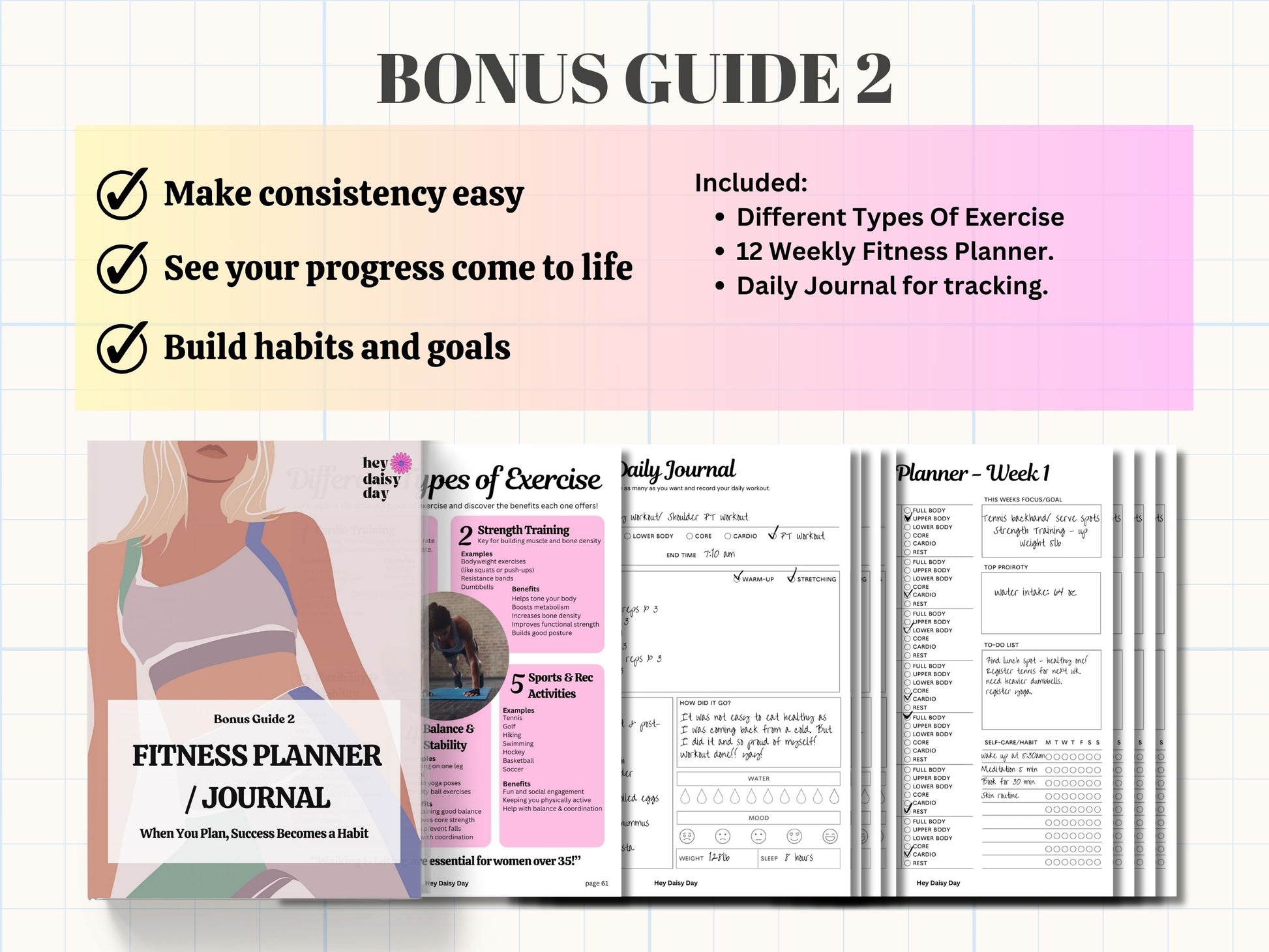 - Bonus Guide 2: Weekly, Monthly, and Daily Fitness Journal/Planner