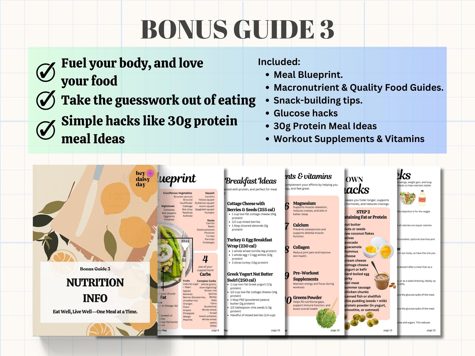- Bonus Guide 3: Eating Guide with 30g protein recipes for breakfast, lunch, and dinner