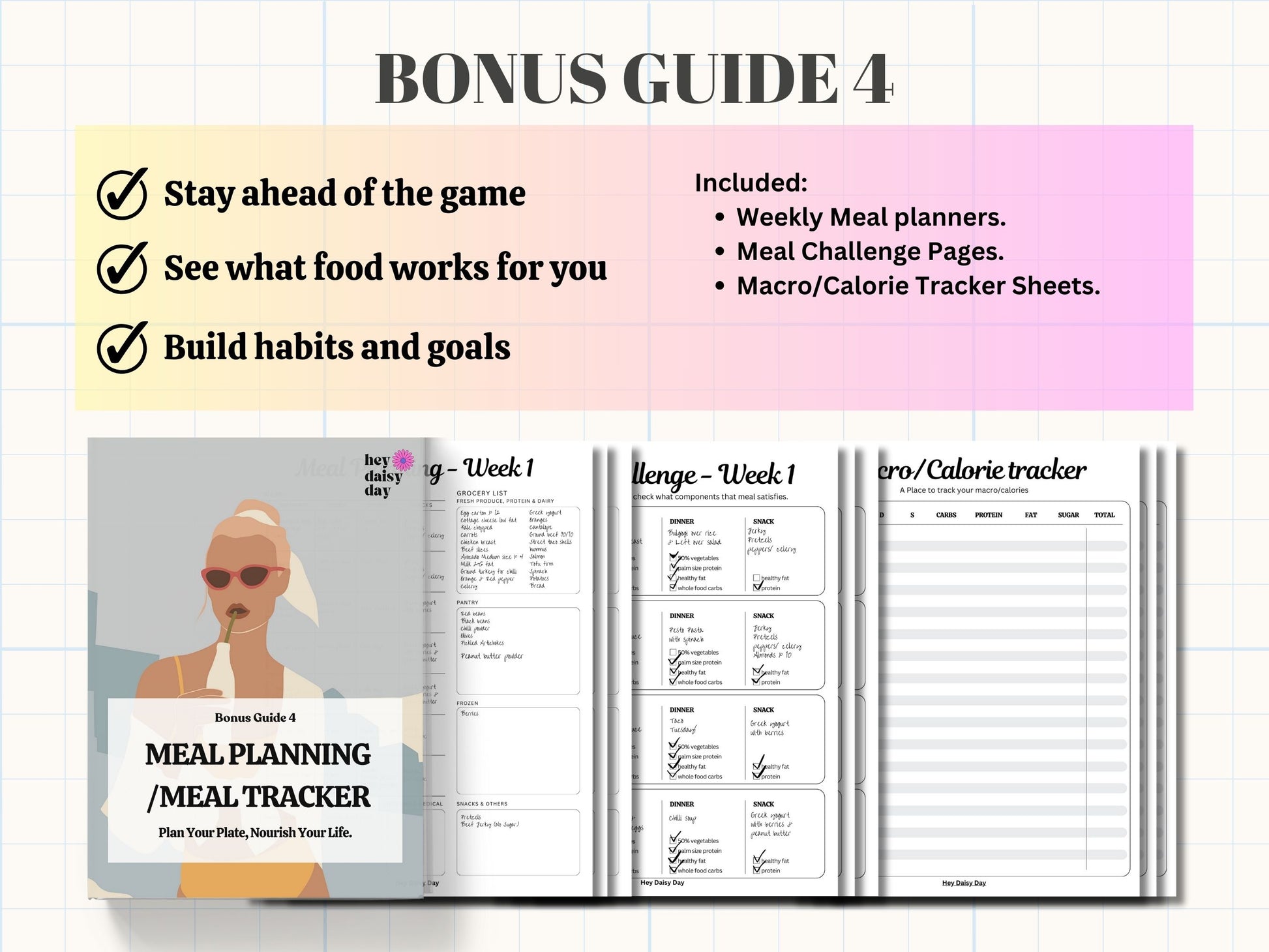 - Bonus Guide 4: Meal Planning & Tracking Tools for weekly meal planning and tracking macros/calories
