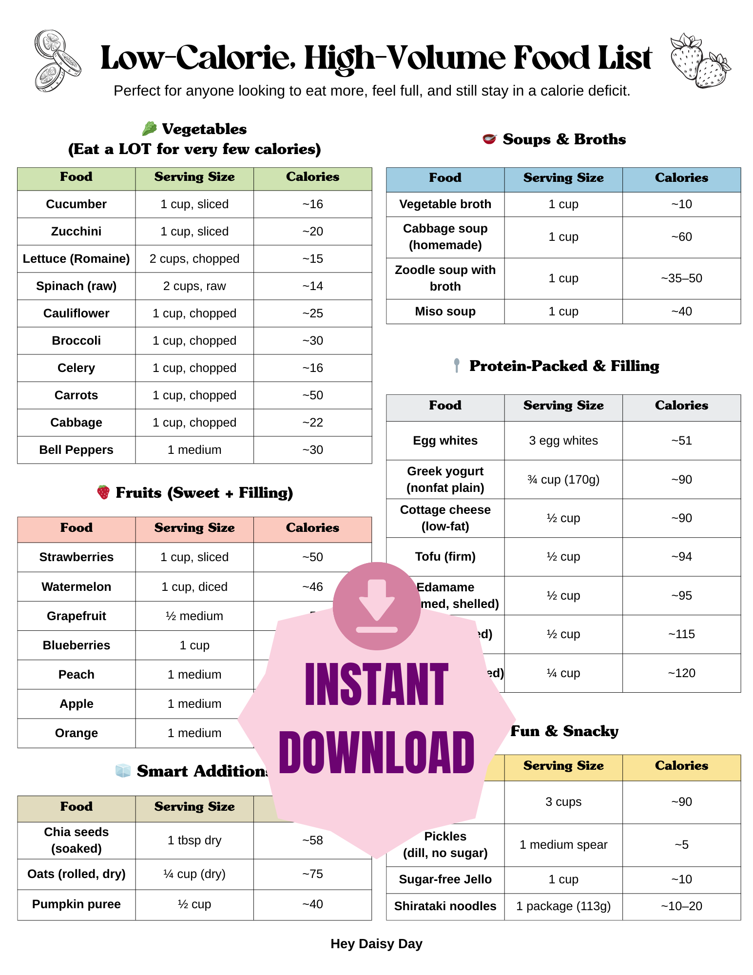 ✨ Clean layout – beautifully organized by food type with portion ideas and calorie counts.