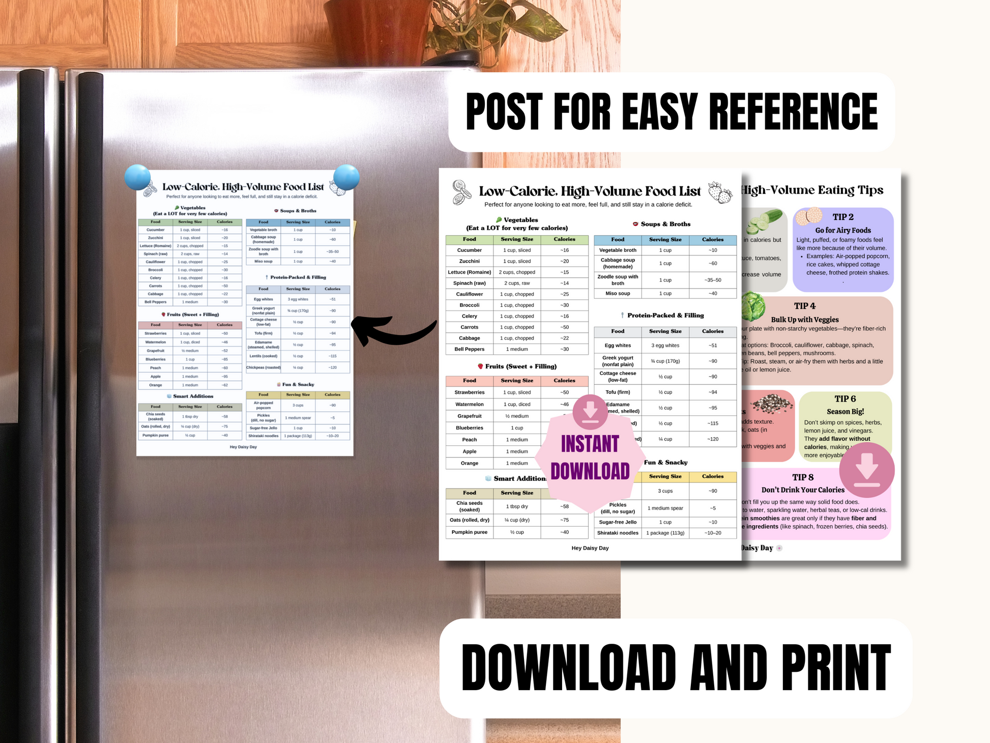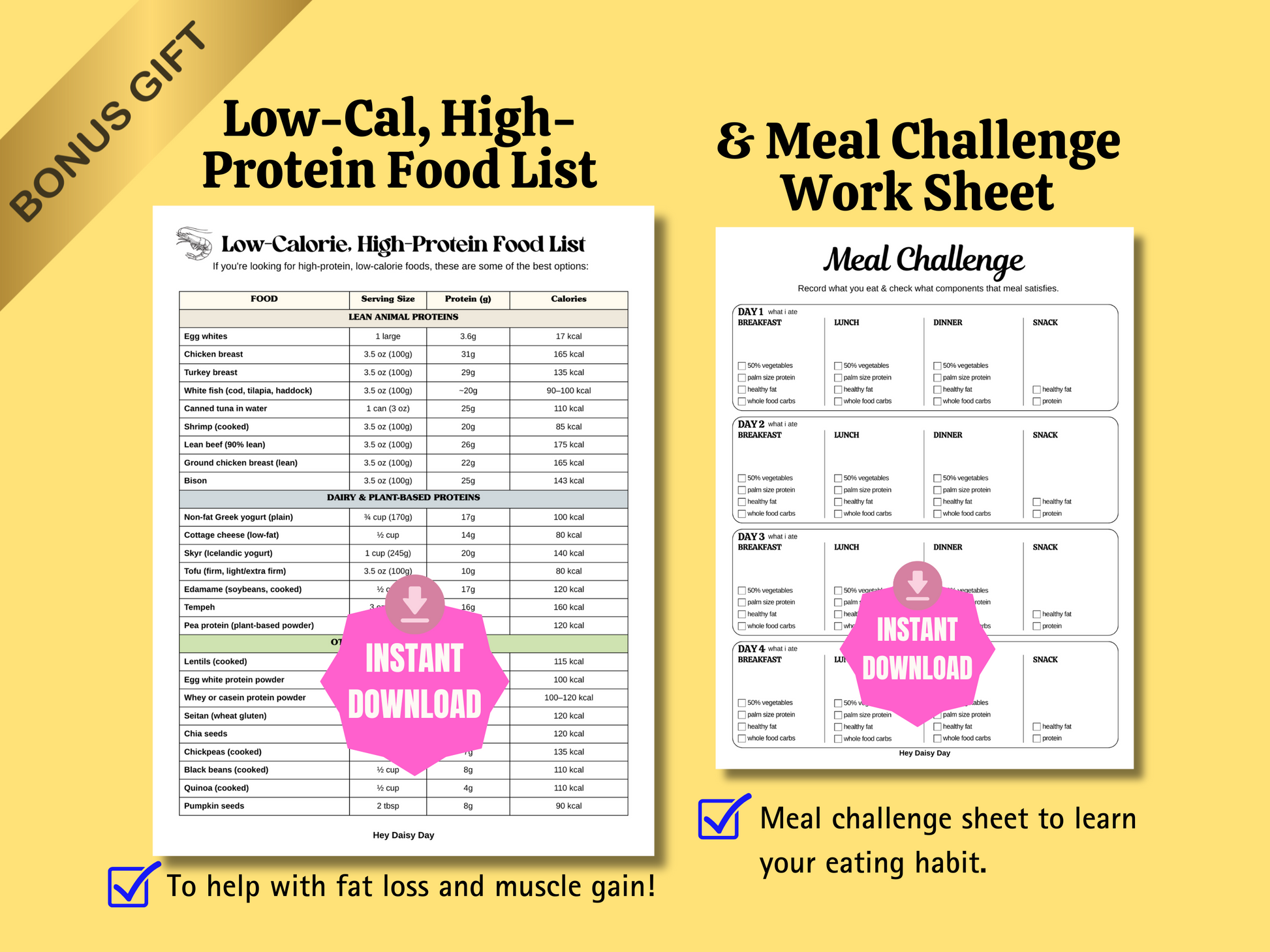 Low Calorie, High Volume Food List + Bonus High-Protein Chart & Meal Challenge Sheet – Your Secret Weapon for Feeling Full Without the Extra Calories!