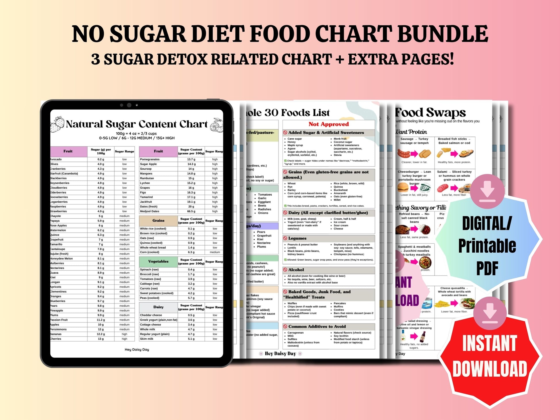 Starting a sugar detox diet or doing a no sugar challenge? This printable Healthy Food Chart Bundle makes clean eating simple — no confusion, no guilt, no complicated rules.