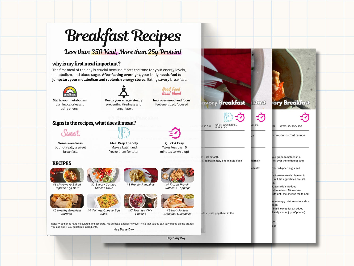 Breakfast, lunch, dinner, and even snacks and desserts are covered, plus extra recipes for salad and dairy lovers!